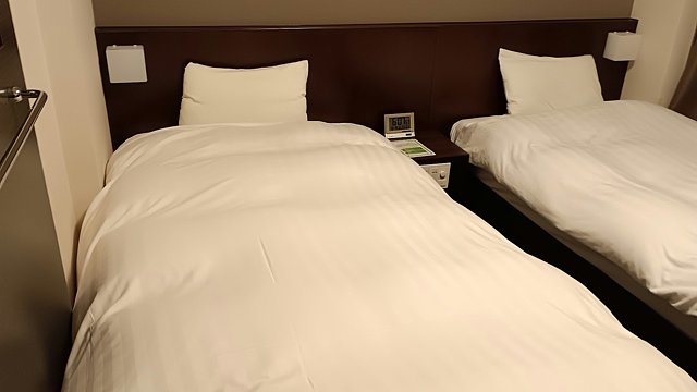 今回はツインルームに宿泊。「ドーミーイン」はビジネスホテルがコンセプトなので、お部屋はシンプル。広さは18㎡でそれほど広くありません。