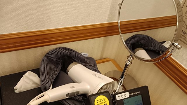 デスクの上に箱ティッシュ、ドライヤー、メイク用ミラー。室内に鏡が多いのが東横インの特徴で、女性2人での宿泊にはありがたいです。