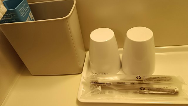 歯ブラシセットとコップ。歯ブラシ立ても用意されていますね。