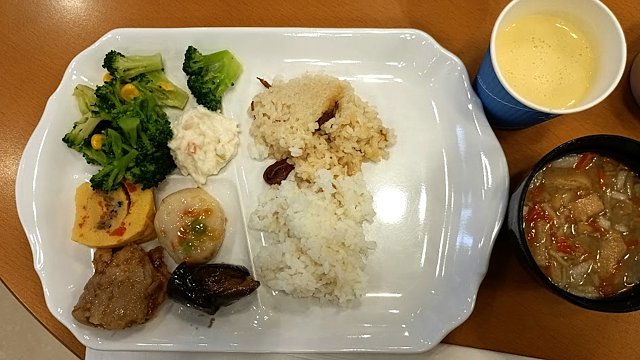 味つけにクセがなく、食べやすかったです。右上の冷製コーンスープと、右下の具だくさん味噌汁が好みでした!