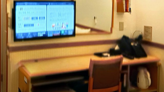 写真がブレてしまいましたが、東横インおなじみのデスク。写っていないですが、上の方にはアナログ式の時計があります。