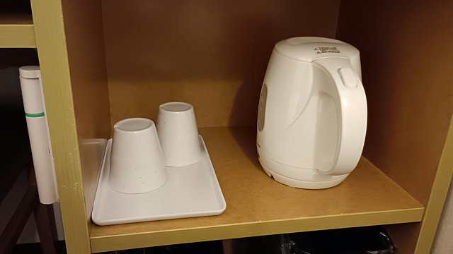 デスクの下に湯沸かしケトル&コップ。ティーパック等はフロント前のアメニティバイキングにあります。
