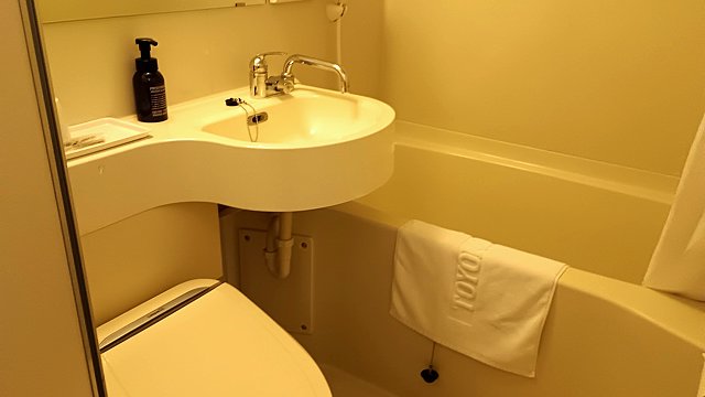 東横インでおなじみの洗面台・トイレ・バスタブがセットになった3点ユニットバス。トイレはもちろんウォシュレットです。